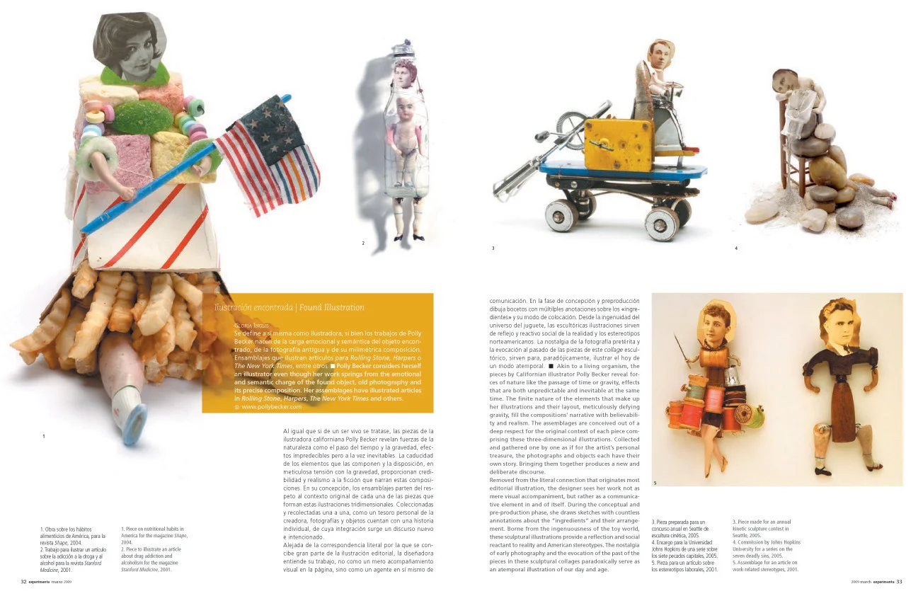 "Removed from the literal connection that originates most editorial illustration, the designer sees her work not as mere visual accompaniment, but rather as a communicative element in and of itself. During the conceptual and pre-production phase, she draws sketches with countless annotations about the “ingredients” and their arrangement. Borne from the ingenuousness of the toy world, these sculptural illustrations provide a reflection and social reactant to reality and American stereotypes. The nostalgia of early photography and the evocation of the past of the pieces in these sculptural collages paradoxically serve as an atemporal illustration of our day and age."