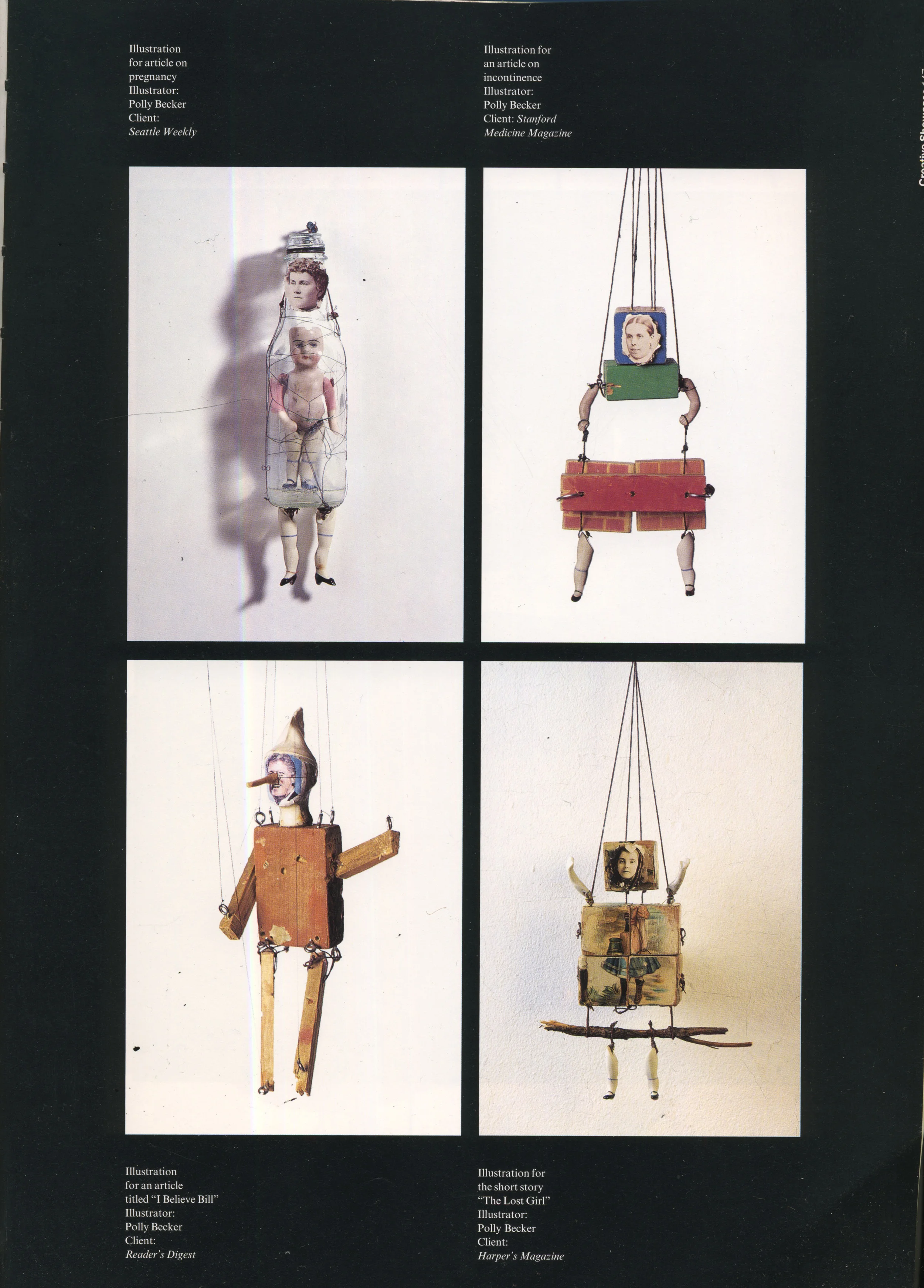 "Polly Becker’s quirky collages and whimsical characters are pure delight. The desire of this American designer to be unconventional and to delight her audience is most certainly achieved, and with great charm."